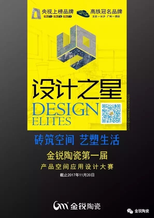 金锐陶瓷2017年进入营销快车道,4月强势登陆中央一套、二套、七套。5月又荣耀冠名“金锐号”高铁列车。企业的发展离不开人才,人才的培养是企业发展的重点,金锐陶瓷一直本着“相信员工有才、助推员工成才”的理念。为给金锐陶瓷全国专卖店设计师提供广阔的发展空间,促进人才快速成长,特举办“砖筑空间·艺塑生活”——金锐陶瓷第一届“设计之星”产品空间应用设计大赛。